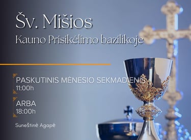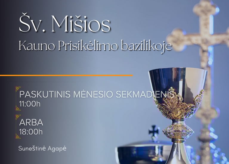 Kiekvieno mėnesio paskutinį sekmadienį Kauno Kristaus Prisikėlimo bažnyčioje švenčiame Eucharistiją kartu – kaip bendruomenė, kaip viena šeima. Tai laikas, kai susirenkame prie Viešpaties stalo, kad iš naujo atiduotume Jam savo gyvenimus, pasikrautume Jo malonės ir sustiprėtume dvasioje. Eucharistija yra tikėjimo viršūnė ir šaltinis – gyvas susitikimas su Kristumi Jo Kūne ir Kraujyje. Ji suvienija mus tarpusavyje, pripildo dėkingumo, stiprina artumą su Dievu ir vieni kitais.